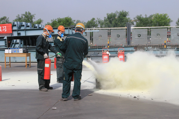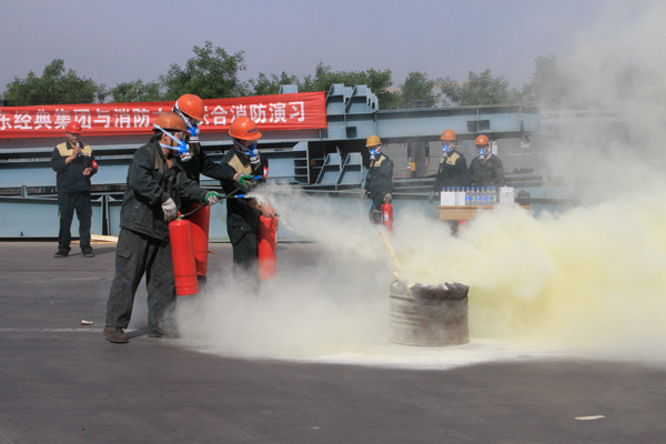 演習前,公司董事長苗樹文作了動員講話,對演習活動進行了部署。伴隨著消防警報響起,演習正式開始。消防應急救援隊立即集合,全副武裝到達指定地點,完成疏導交通和消防警戒,建立了應急通訊,集團領導下達救援命令后,一組救援人員手持干粉滅火器對準火源根部由近及遠進行掃射,迅速撲滅了火苗,二組救援人員使用高壓水槍對火源進行噴射,同樣達到了滅火的目的。演習結束后,區(qū)消防大隊趙怡然隊長對演習進行了指導點評。總經(jīng)理杜福生對消防演習進行了總結,對消防安全工作提出具體要求。