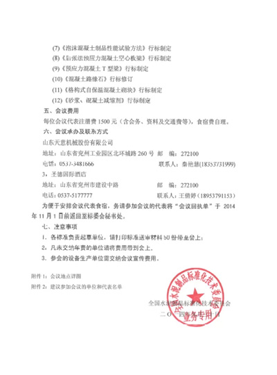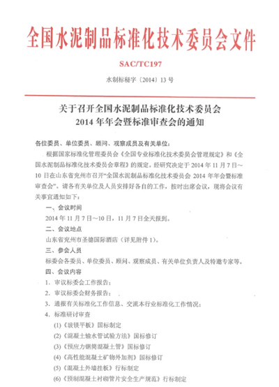11月7日-9日全國水泥制品標(biāo)準(zhǔn)化技術(shù)委員會2014年年會暨標(biāo)準(zhǔn)審查會在山東天意機械股份有限公司隆重召開。屆時,委員會相關(guān)領(lǐng)導(dǎo)及行業(yè)相關(guān)科研人員將蒞臨會議,共同商討制訂行業(yè)有關(guān)標(biāo)準(zhǔn)。誠邀各界人士屆時蒞臨天意機械、經(jīng)典集團、卓越精工參觀指導(dǎo)。