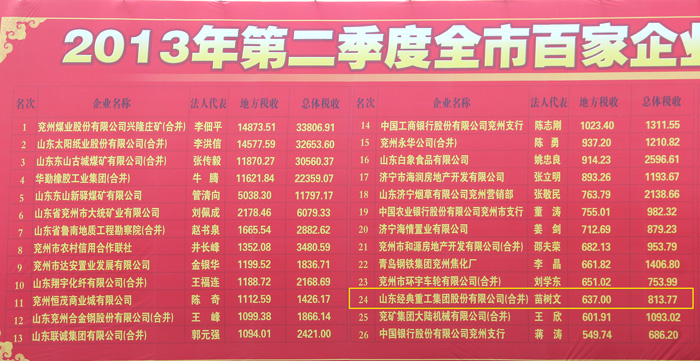 經(jīng)典集團(tuán)2013年第二季度納稅躍升兗州生產(chǎn)制造業(yè)前十強(qiáng)